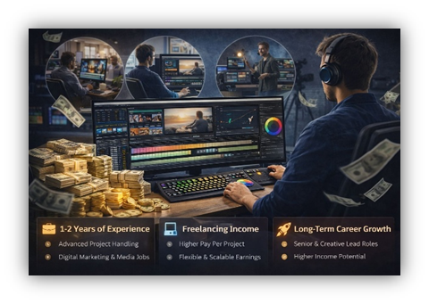 Salary depends on skills, experience, and work type. Freshers usually start with basic editing roles, while experienced editors earn higher salaries. Freelancers can earn per project, and skilled editors often grow faster with experience and specialization.