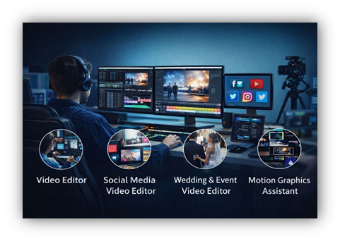 Video editors are hired by production houses, digital marketing agencies, media companies, event firms, and online creators.