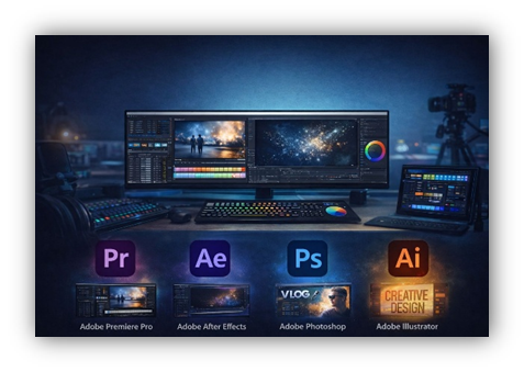 Students learn industry-standard tools such as Adobe Premiere Pro, Adobe After Effects, Adobe Photoshop, and Adobe Illustrator. These tools are widely used by professionals in studios, agencies, and production houses.